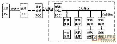 我院的“智能建筑自动化系统”采用可编程计算机控制器( Programmable Computer Cont roller -PCC) ,其中暖通空调子系统采用一个PCC 分站带4 个子系统丛站(扩展模式) ,一次回风空调系统由其中的一个丛站控制。各分站、丛站之间采用CAN 网标准物理接口,控制网络拓扑图见图2 。