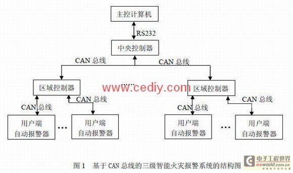 基于CAN总线的三级智能火灾报警系统的结构图如图1所示。该系统由三级通信控制系统组成。这三级通信控制系统分别是:第一级:主控计算机通过RS- 232总线接收中央控制器的报警信息;第二级:中央控制器通过CAN总线接收区域控制器的报警信息;第三级:用户端自动报警器的报警信息通过CAN总线传输至区域控制器。此三级网络可以组成不同的网络形式,针对这种情况,对于小型区域,该系统可以省略区域控制器。可见,该系统针对不同的对象可实现最优的性能价格比和最广的应用覆盖面,提高产品的竞争能力,扩展特别的方便。