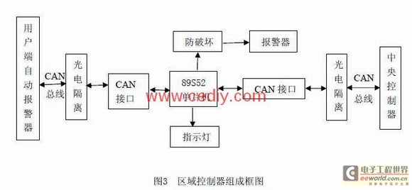 区域控制器组成框图如图3所示。区域控制器选用Intel的89S52单片机芯片为控制核心,在其与用户端报警器相连的CAN端口侧,安装了CAN总线收发器,以及光耦隔离防干扰装置,解决了与用户端报警器之间的信号交换问题。而与中央控制主机相连的CAN端口侧,同样安装了CAN总线收发器,解决与中央控制主机之间的信号交换问题。另外,加入防破坏识别模块和报警器模块可使物业监控主机及时发现对区域控制器线路的人为破坏,并及时修复。
