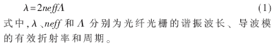 光纤光栅的周期在几百纳米数量级。当某一宽带光源的光入射到光纤光栅中时,折射率分布的周期性结构导致某一特定波长光的反射,反射光的波长(即谐振波长)由Bragg公式确定: