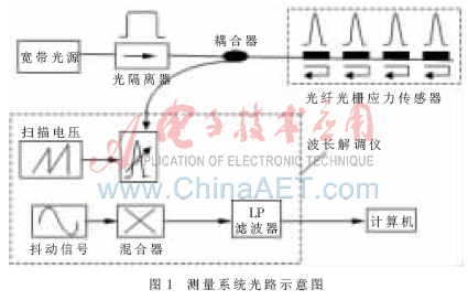 图1给出了光纤光栅应力传感器与波长解调仪组成的应力测量系统。