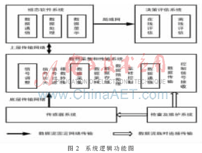 铁路在线监测系统包括数据测量系统和数据管理与分析两大子系统。其中,数据测量系统由传感器子系统和数据采集与传输子系统有机地组成;数据管理与分析系统包括监测数据管理子系统和数据分析处理子系统。系统逻辑功能如图2所示。