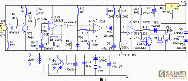 该装置采用9-12V直流电源供电,由T降压,全桥U整流,C10滤波,检测电路采用IC5 78L06供电。本装置交直流两用,自动无间断转换。