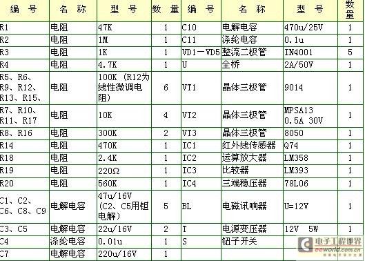 安装无误,接上电源进行调试,让一个人在探测器前方7-10m处走动,调整电路中的R12,使讯响器报警即可。其它部分只要元器件质量良好且焊接无误,几乎不用调试即可正常工作。