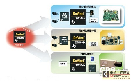 Davinci系列包含成熟的视频软件、完善的开发工具和有力的技术支持,因此一个原型设计可以衍生出数字视频录像机、数字视频服务器和IP网络摄像机等更多的产品形态。Davinci所构建的是一个数字媒体开发框架,并将为各个系列的平台所共享。