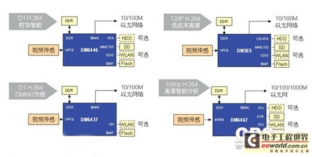 IP网络摄像机方案是一个很典型的视频监控产品,客户对其产品规格由不同的需求,对此Davinci以统一的数字媒体框架提供不同平台的支持。DM6446可支持D1下H.264并附加智能视频功能;DM6437可作从DM642平台升级同样支持D1下H.264;基于DM355的IP摄像机在业内备受青睐,其突出特点是可以单片支持MPEG4高清720P编码,同时还可支持一个CIF流。视频前端可直接连CCD或CMOS传感器。片上有各种存储接口。该片软件免费捆绑提供,工艺采用低功耗设计,易于实现小型一体化设计。刚刚推出的DM365除具有上述所有优点之外,增加了对高清H.264的支持,且集成音频和网络等增强功能,而且视频前端有ISP单元,可支持人脸检测、视频稳定和噪点去除功能;DM6467可支持1080P下H.264高清并由所集成DSP核心C64+支持高级视频智能分析功能,并支持高清BT1120高清输入和千兆以太网接口。如图2所示为基于不同Davinci的IP网络摄像机方案。