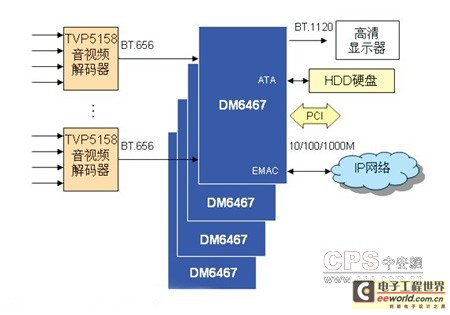 DM6467属于Davinci-HD,即单片支持1080P高清H.264编码,其核心处理由两个视频协处理器实现。DM6467单片多路能力极强,可支持H.264格式实时四路D1或十六路CIF,而升级到千兆主频后更是能单片可支持H.264格式实时八路D1。DM6467可通过PCI或千兆网络口扩展级联,而TVP5158也可支持级联,于是就可实现不同分辨率和不同视频路数下的组合,最高可达H.264格式实时十六路D1。如图3所示为基于Davinci-HD的多路系统方案,核心为多片DM6467,视频扩展由多片TVP5158。值得一提的是每片DM6467的DSP都有能力处理每路视频所需的智能分析。