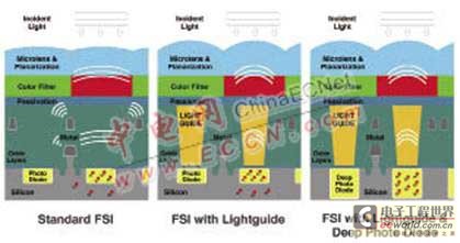 标准IC制造工艺和成像专用工艺在不断进步,促进了采用前面照度(FSI)技术的图像传感器的开发。在这种技术中,如同人眼鹰一样,光落在IC的前面,然后通过读取电路和互连,最后被汇聚到光电检测器中。FSI为目前图像传感器所采用的主流技术,具有已获证实的大批量生产能力、高可靠性和高良率以及颇具吸引力的性价比等优势,大大推动了其在手机、笔记本电脑、数码摄像机和数码相机等众多领域的应用。这些优势,再加上高性能特性,使得这种技术具有独特的成本、性能和价值定位,未来应用有望进一步扩展。