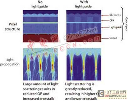 虽然光导管是设计用于聚集从微透镜发出的光,并使其以窄光束形式通过互连金属和隔离堆叠,但它仍然能够有效缩短光堆叠高度(见图1中心的示意图),使平行光束被导入光电二极管区域(图2)。