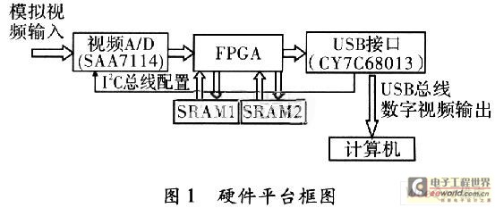 芯片工作在Slave FIFO的接口方式下,在该模式下外部逻辑直接控制接口芯片内部的FIFO。其工作过程是,当USB设备接入计算机时,计算机和USB设备之间产生枚举过程,计算机检测到有设备接入,自动发出查询请求,USB设备回应请求,返回设备的Verdor ID和Product ID,计算机据此装载相应的驱动程序,完成重枚举过程。计算机通过USB发出采集指令后,启动A/D和FPGA,红外图像的一帧经过SAA7114处理送到SRAM,然后通过USB芯片上传给计算机。在上传过程中,两片SRAM分别存储一帧图像的奇偶场,当一片用于存储时,另一片用于传输已存储的图像,如此往复完成实时视频图像采集。