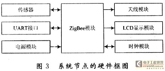 系统选用的ZigBee设备为基于Jennic公司的JN5139 ZigBee解决方案,它提供了完整的ZigBee协议栈、软件编辑、编译/链接、调试、下载等工具。JN5139芯片是英国Jennic公司推出的高性能、低功耗的一系列无线芯片,该系列芯片天线的灵敏度高、功耗低、通讯距离远,为ZigBee技术提供了良好的解决方案。系统节点框图如图3所示。