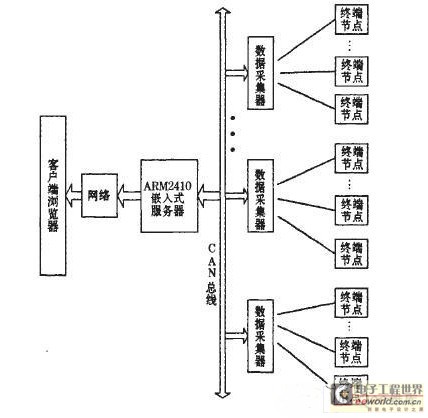 系统采用了分级组网的方式,由有线和无线通信两级网络组成。考虑到工业干扰比较严重,以及通信范围能有较大的冗余,嵌入式服务器与数据采集器之间使用有线网络,采用CAN总线传输。另外,系统使用了数据采集器作为中间媒介,将无线终端和ARM主控机连接在一起,解决了无线系统因受通信距离、空闯布局、外部干扰等因素的限制,致使无线通信的节点无法直接与主控机通信的问题。对附近的无线终端,数据采集器使用无线信道通信,对主控机,使用CAN连接,这样就较好地解决了应用环境对无线通信网络的不利影响。而且,更为重要的是,可根据实际需要使用你N个数据采集器分别挂在CAN总线上,采用N个频段传输,减少了无线通信中的冲突,增加了通信的可靠性。