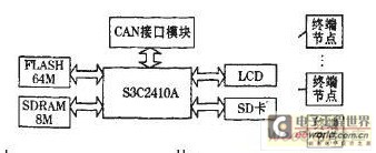 基于S3C2410A扩展了CAN接口模块、sD卡等,CPU采用$3C2410A微处理器作为整个系统的控制核心。S3C2410A是基于ARM920内核开发的32位RISC微处理器,集成了丰富的外围功能模块,如以太网接121,便于低成本设计嵌入式应用系统。S3C2410A主要功能就是通过控制以太网接口芯片CS8900A及CAN通信接口芯片MCP2510的工作,实现CAN通信协议与以太网通信协议的转换,使远端用户借助浏览器经由Intemet对现场设备实施远程监控。