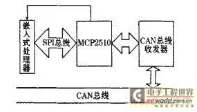由于多数嵌入式处理器都不带CAN总线控制器,在嵌入式处理器的外部总线上扩展CAN总线接口芯片是通用的解决方案。设计采用了MCP2510芯片作为CAN总线的控制器,该芯片支持CAN2.0B标准。TJAl050作为CAN总线的收发器。