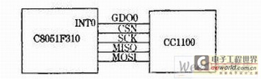 CC1100模块与CPU是采用SPI口进行通信的,只需把CCll00的SPI口接到CPU的硬件SPI口上,另外,再将CCll00的GD00或GD02也接在CPU的任意引脚上。如果想要用中断处理收发数据或是想做无线唤醒的话,该引脚必须接在CPU的外部中断引脚上。如图4所示。