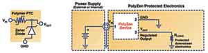 新一代增强聚合物齐纳二极管也可以保护敏感的电子器件免于被感应电压尖峰、瞬态过压、不正确的供电和极性接反等所损坏。如图1所示,PolyZen器件包括一个用于电压钳位的稳压齐纳二极管和一个非线性PPTC薄膜器件。