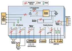 图2描述了一个典型的用于安防和火警系统的电路保护方案。其中,过流保护是通过PolySwitch PPTC器件实现的。过压保护是通过金属氧化物变阻器和PESD器件实现的,并且集成了前面所描述保护设备I/O端口的PolyZen和2Pro器件。