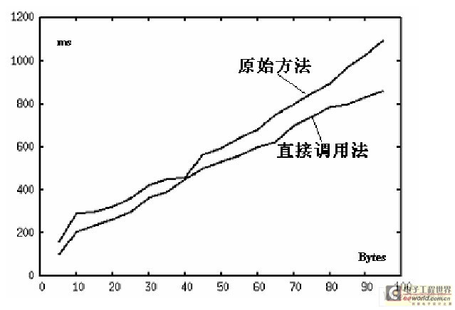 工作效率测试中应用产生50 个数据包后调用MAC 层发送接口发送这50 个数据包,从应用调用MAC 层数据接口时开始计时,到应用层收到包成功发送的确认消息为止。记录下这个响应时间,并依次增大发送数据包的的有效载荷,从10 个字节增加到90,记录下有效载和增加时的响应时间。效率测试将分别在原始方案和直接调用法开发出来的协议中进行,统计两种不同方法的工作参数,最后得到的时间分布如图5 所示。