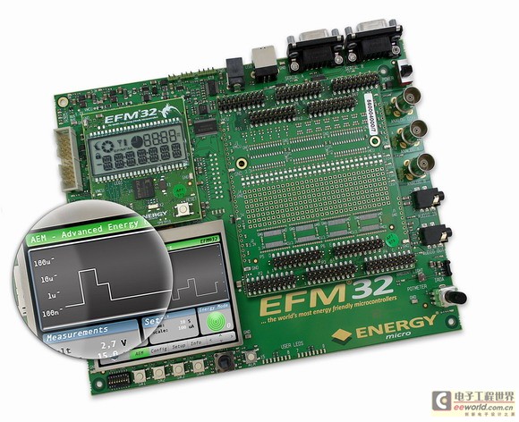 设计实施ARM内核以实现在nanoamp区最深睡眠状态的电流水平只是低能源战略的一个步骤。能够提供一个32位内核的处理能力为控制能源使用开辟了新途径, 在任何时候,它是MCU供电图下面的区域,随着时间的推移,它表示从电池里取走的电荷(图2)。就是这样,在具体配置中电流消耗的大标题数字越多,设计人员就必须密切注意要最大限度地延长电池的使用寿命。在EFM32微控制器的开发工具包中,这种测量是很清楚的; 这个工具包的基本功能部分是其先进能源监控器(图3)。该设施在填充MCU内核的电流轨中不断测量电流;一个从模拟到数字的转换器(ADC)通过电阻器采集电压,而开发工具包软件集成其读数来精确测量不同时间的功率。