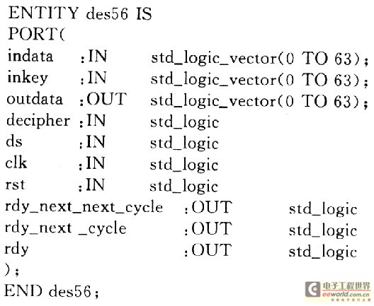 S盒是DES中的非线性模块,直接决定DES算法的安全性。在函数f的实现中,采用上面的思路,使用例化调用了S盒。DES加密核的VHDL设计思路如下:首先调用库函数构造ROM,然后使用VHDL语句进行行为描述。这种方法要结合器件的内部结构,对于小容量的ROM采用数组描述,大容量的ROM应采用元件的方式来实现。在VHDL设计中,库函数、子程序的调用以及元件的调用和使用间接变量,都是影响速度的主要因素。由此得到DES Core的接口定义如下: