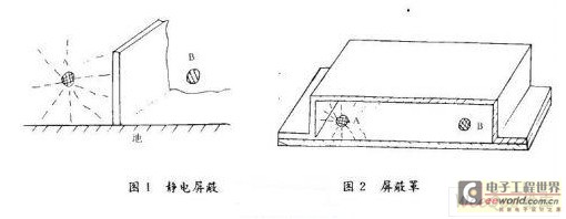 屏蔽方法:将一块金属板置于两个被屏蔽的电路中间,并使各金属板与地作电气连接,如图l所示。这样从一点发出的电力线均被屏蔽板挡住,即起到静电屏蔽作用。