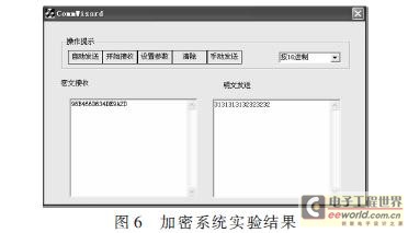 图6显示了本文设计的加密系统的实验结果。通过PC机和RS-232串口发送字符‘11112222’的十六进制形式为‘3131313132323232’共64 bit,TMS320VC5410接收到64 bit明文数据后,通过读取IC卡中的64 bit密钥‘310000000000031’并对明文进行DES加密后,输出密文的十六进制形式为‘96B466D634DE9A2D’。结果显示系统工作稳定可靠,符合设计要求。