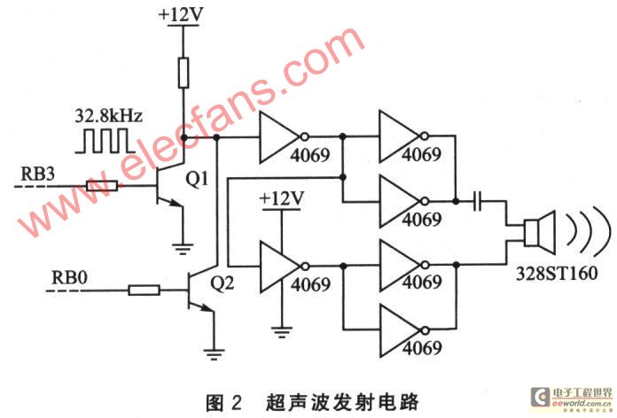 发射部分电路图如图2所示。超声波发射换能器采用328STl60,其中心频率为32.81.O kHz。使用PIcl6F628A单片机的PWM控制器,由RB3端口输出约32.8 kHz的方波信号,并通过三极管Q1和4069进行电压和电流的放大,从而驱动发射换能器发射出超声波信号。其中三极管Q2是为系统自检而设计的。在正常的探测过程中,RBO端口一直输出低电平,使三极管Q2保持截止状态,不会影响超声波发送换能器的正常发射。