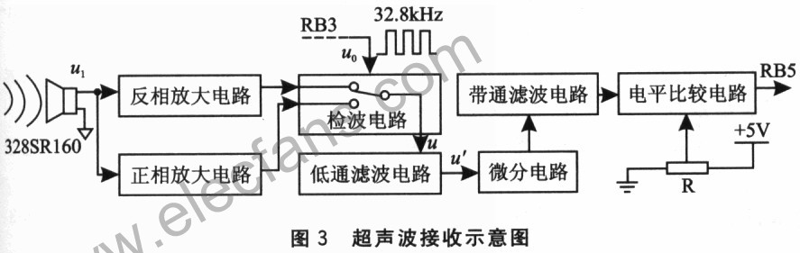 接收部分电路图如图3所示。超声波接收换能器采用328SRl60,其中心频率亦为32.8士1.0 kHz。由于接收换能器直接接收到的信号比较微弱,首先需要通过运算放大器进行放大。这里使用的运算放大器型号为TLO62,为了配合后面进行检波,分别组成正相和反相放大电路。检波电路实际上使用了双向模拟开关芯片4066,利用超声波发送的驱动信号作为检波的参考信号,即由RB3控制4066的模拟开关的切换。当RB3电平为高时,连通正相放大电路;当RB3电平为低时,连通反相放大电路。这相当于把放大之后的信号不停地乘以土1,其切换频率和超声波的发送频率一样。设该频率为,fo,则模拟开关所产生的等效信号是频率为fo,幅值为土1的方波,设之为uo。则由傅里叶级数可得uo。的表达式为: