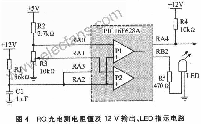 另外,调节R3可以使+12V电平信号的持续时间在15~1800 s变化。该功能主要利用单片机内部的两个比较器,结合外围RC充电电路来实现对:R3位置的检测。具体过程如下:通过对单片机的控制字进行设置,使比较器P1和P2的正相输入端在单片机内部连接在一起并与RA2端口相连,RA0、RAl、RA2都为输入端口,如图4所示。