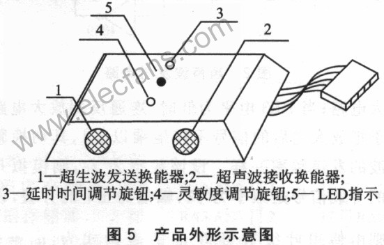 该装置外形如图5所示,底部有悬挂卡口,可以方便地安装在通道的墙壁上。顶部的灵敏度旋钮可以调节探测的灵敏度,延时时间旋钮可以调节来人之后照明装置点亮的时间。顶部的LED能够指示正常状态下的探测情况以及自检失败时的故障。