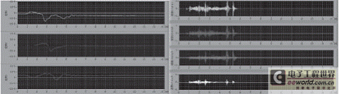 左图为应变曲线,由上到下分别为1/4 桥跨、1/2 桥跨、3/4 桥跨处的应变信号;右图为速度曲线,由上到下分别为1/4 桥跨、1/2 桥跨、3/4 桥跨处的速度信号