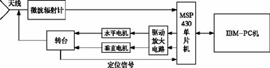 系统采用主从式计算机进行工作,其中主机采用PC机进行人机对话以及实时成像,从机采用MSP430F149单片机进行步进电机的智能控制以及高速数据采集,主从机之间采用RS232串行通信端口进行通信。成像时,先由PC机送出命令参数,再由单片机根据命令发出相应的控制信号通过驱动放大电路进入电机,分别或者同时控制两台电机的转向与转速,使得辐射计天线进行自动扫描,同时辐射计将接收到的信号进行积分后输入到MSP430单片机集成的12位ADC的模拟信号输入通道,进行12位的A/D转换,然后由单片机通过串口发送程序送入主机存储并显示相应的伪彩色图像。