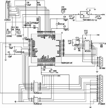 MSP430F149与PC机的通信采用RS232串行通信总线,采用HARRIS公司生产的ICL232作为RS232电平转换芯片。