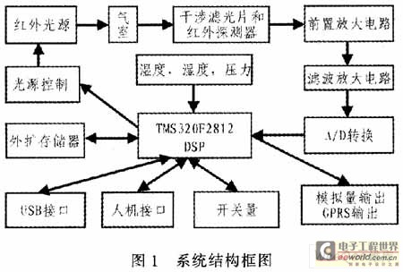 从国内现有的红外分析器来看,大部分在线监测仪需上位机配合完成数据的后期处理和保存,前端仅仅完成信号探测和采集的功能,这样的设计在一些安装受限或长期无人监管(如污染源监测)的场合就不能适用了,针对这种状况,本文研究开发一种基于TI公司的DSP的非分光红外气体分析仪,能够独立完成监测工作,并可将数据储存在大容量闪存中或通过GPRS远程传输,该仪器的简洁人机接口使无论测量还是仪器标定都可方便完成,同时USB接口的添加使仪器有了更大的扩展空间,并且仪器拥有多种信号输出方式,可以轻松与各种系统连接。