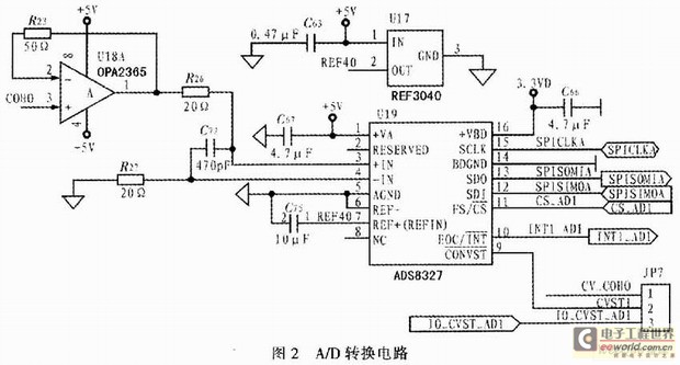数据采集主要负责模数转换和信号采集,将各种需要测量的模拟量通过.A/D转换后送到DSP。其中测量通道和参考通道的信号由红外探测器产生,由一个A/D转换器转换,转换精度为16 bit,根据要求选择可直接与TMS320F2812接口的串行16 bit A/D转换器;其他参与气体浓度补偿计算的信号,包括湿度、温度和大气压力信号由TMS320F2812自带的A/D分时转换,转换精度为12 bit。以上信号转换后送到DSP处理器缓存。经系列复杂计算处理最终得到被测气体的浓度值。这里给出用于测量通道和参考通道信号采集的电路设计,如图2所示。