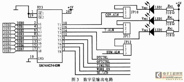 开关量输出主要包括探测器温度控制信号、光学镜头窗温控信号、要素报警触发信号(浓度,温度,湿度)3路和1路时间触发信号。利用DSP处理器的通用I/O口可实现数字量的输出,74HC244实现各控制信号的驱动输出。图3为数字量输出电路图。需要注意的是:TMS320F2812处理器的电源电压为3.3 V,而74HC244的电源电压为5 V,两个器件存在接口电路的电平转换问题,不能直接连接,采用LVCl*5作为电平转换器,实现TMS320F2812和74HC244之间的电平匹配。
