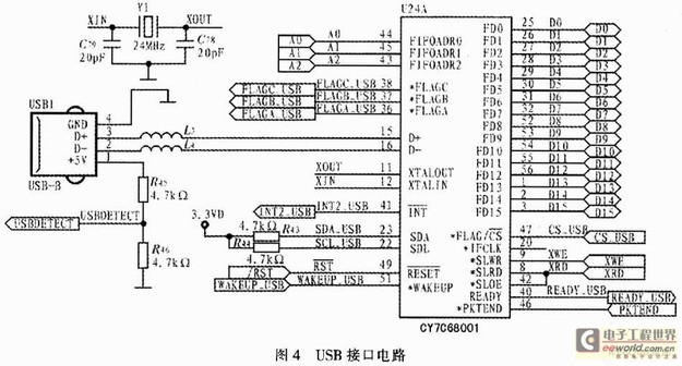 USB接口用于下位机与上位机通讯。USB的数据传输率很高,所以不仅可以用来传送命令,而且可以实时传输数据,包括原始测量值,当前浓度值,或历史记录值,图4给出 USB的接口电路原理图。