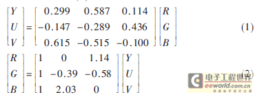 在色彩学上,为了可以准确定量地描述颜色,将色彩定义为三大属性:“Y”表示明亮度,即灰度值;“U”和“V”表示色度,作用是描述图像色彩及饱和度,用于指定像素的颜色。根据美国国家电视制式委员会NTSC制式的标准,白光的亮度用Y来表示,色差U、V由B-Y、R-Y按不同比例压缩而成,与红、绿、蓝三色光的关系可用式(1)描述,这也是常用的转换公式。YUV到RGB的转换公式则如式(2)所示。