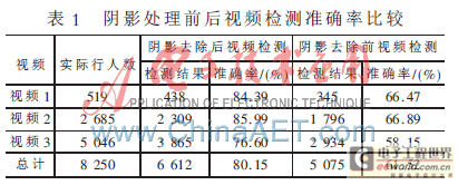 视频图像中的阴影会影响行人的检测与跟踪,因为阴影的存在会造成检测目标的变形、合并、甚至丢失,使得目标定位及计数不准确。近年来,科研工作者对图像中的阴影去除问题进行了大量研究,在这些研究方法中,考察的图像特征主要有三种:光谱特征、空间特征和时间特征。光谱特征针对像素点,如灰度值、颜色信息等,根据当前图与背景图的色差、亮度差值等判断像素点是否为阴影,或者对图像进行变换得到光照无关图进而去除阴影;空间特征是针对某一区域或某一帧图像,根据检测到的图像的轮廓、纹理、边缘等信息判断是否为阴影,如利用图像的轮廓特征,找到目标与阴影的边界线,对本体和阴影粗分,再建立阴影像素的高斯模板进行细分,既减少了计算量又能达到较好效果;时间特征一般都是与前两种特征结合使用,可以用于对阴影方向或运动速度的估算等,以进一步提高阴影去除效果。