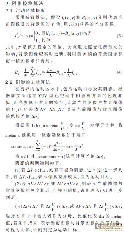 式中,R、G、B的取值范围均为0"255。通常摄像机的数据以RGB、YUV或YCrCb的格式输出。采用YUV颜色空间的重要性是它的亮度信号Y和色度信号U、V是分离的。目前有很多种颜色空间可以将图像的色度分量和亮度分量区分开来,如HSV颜色空间,但是这种转换较为复杂,对于大型图像非常耗时,并且在亮度值和饱和度较低的情况下,采用HSV颜色空间计算出来的H分量是不可靠的。