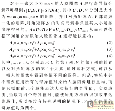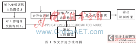 自20世纪90年代以来,人脸识别技术已成为计算机视觉、模式识别和信息技术等领域研究的热点课题之一,并且在此基础上提出了主成分分析PCA(Principal Component Analysis)[1,2]、二维主成分分析2DPCA(Two-Dimensional Principal Component Analysis)、双方向的二维主成分分析和线性鉴别分析LDA(Linear Discriminant Analysis)等有效的识别方法。但是,现有的正面人脸图像的识别方法,仅当有充分数量的有代表性的人脸图像样本时才能取得较好的识别效果。然而在一些特殊场合,如法律实施、海关护照验证和身份证验证等,每类(人)只能得到一幅图像,此时就只能用这些数目有限的图像去训练人脸识别系统。若用前面提到的那些方法处理这种训练样本数目有限的人脸识别系统,识别率会明显下降,甚至变得不再适用。参考文献首先对原始人脸图像利用奇异值分解,然后运用分解得到的较大的几个奇异值对原始人脸图像近似重构,并且将重构人脸图像和原始图像一起作为训练样本,从而对原训练样本个数进行扩展,再对增加了训练样本后的样本集运用2DPCA方法进行特征抽取,该方法可取得较好的识别效果。但是由于人脸图像存在姿态、表情等变化,而且这个变化越大,算法的识别误差也越大。基于此,本文提出了一种基于图像镜像和奇异值分解的镜像奇异值分解方法。该方法首先对人脸图像做镜像变换,然后对原始人脸图像和镜像图像分别做奇异值分解,接着用较大的几个奇异值分别对原人脸图像重构,将这些重构图像、原图像以及镜像图像一起作为训练样本运用(2D)2PCA方法对其进行特征抽取,最后使用基于最小欧氏距离的分类方法对样本集进行分类识别。由于考虑了人脸图像的旋转等姿态变化,在ORL人脸数据库上的实验结果表明,该方法比参考文献中的方法有更好的识别性能。