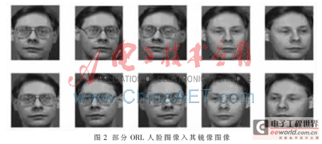 本实验所用人脸数据库为ORL人脸库,该人脸数据库由40人、每人分别由10幅大小均为112×92的256灰度级的正面人脸图像组成,这些图像是在不同时间、不同光照、不同表情和不同姿态下拍摄的。图2给出了ORL人脸数据库中的部分标准人脸图像及其镜像图像。