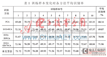 为了对各方法的识别效果进行对比,本文分别对单样本PCA算法、SVD+PCA算法、参考文献中提出的SVD+2DPCA算法、SVD+(2D)2PCA以及本文提出的方法在ORL人脸数据库上进行10组实验,即分别将每个人的第1,2,3,...,10幅共40幅人脸图像作为训练样本,而其余的360幅图像作为测试样本进行分类识别,然后取其平均识别率,测试结果如表1所示。以下(2D)2PCA方法中行方向降维维数为10,即只对其列方向维数做变化。