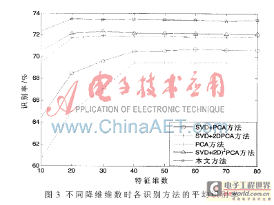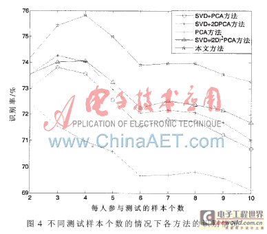 不同的特征提取方法的确会对系统识别率的提高有一定的影响,为了验证本文方法识别率的提高不仅仅依赖于(2D)2PCA特征提取方法的选择,而是由于镜像人脸图像样本的增加,实验中分别对单样本PCA算法、SVD+PCA算法、SVD+2DPCA算法、SVD+(2D)2PCA算法以及本文算法在ORL人脸库上,同样分别将每个人的第1,2,3,...,10幅图像作为训练人脸图像,而将其余的360幅作为测试样本,取同一特征向量维数下的10组实验的平均识别率作为其最终识别率,测试结果如图3所示。