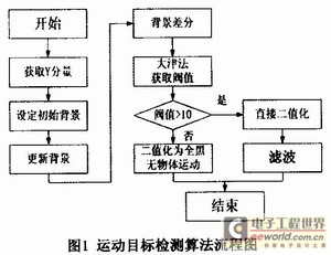 实现运动目标检测的算法很多,一般有光流法、背景差分法、相邻帧间差分法等。光流法通过求解光流方程来实现运动检测,其算法复杂、计算量大,且较难满足实时要求;而相邻帧间差分法虽然算法简单、运算量小,但抗干扰能力很差,检测效果不太理想;而背景差分法算法简单、运算量小、且抗干扰能力强,因此本文采用该方法实现运动目标检测。具体步骤如下:首先获取数字图像进行预处理,之后采用背景差分法实现运动检测,再对所得的图像用大津法进行自适应阀值分割,最后通过滤波得到检测出的运动目标。图1是本文运动目标检测的流程图。