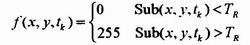 基于以上的分析,本文采用改进的方法,如果大津法获取的阀值小于10,则说明没有物体运动,否则说明有物体运动,当阀值小于10时,按照下式进行二值化处理: