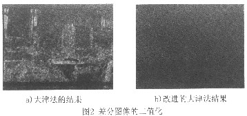 即当没有物体运动时,获取的二值化图像应为全黑,这样后续的形态学处理只需对有物体运动时的二值化图像进行处理即可。图2分别为无物体运动时直接二值化和采用改进方法二值化后的结果。其中a)为直接采用大津法获取的阀值分割没有物体运动时的差分图像的结果,可以看出图中布满噪声;b)为对大津法获取的阀值进行判断后,没有物体运动时的差分图像分割的结果,可以看出此时图像为全黑,也即没有运动物体,这与实际情况相符,简化了后续的形态学处理。