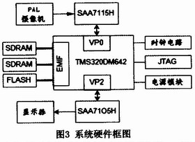 硬件平台采用TMS320DM642作为CPU,该芯片主频600MHz。视频编解码芯片采用SAA7115H和SAA7105H。另外采用了两片SDRAM(共4M×64bi-t)芯片作为存储介质,用于图像的暂时存储,同时还采用一片FLASH用于实现自启动,硬件平台框图见图3。
