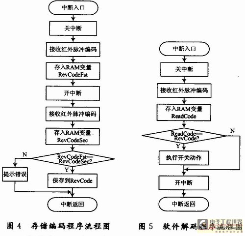 当按下“记忆”按键S1时,单片机进入存储记忆红外遥控编码的状态。ATmega8L单片机首先关闭中断,等待遥控器发出的红外遥控编码输入。当红外遥控编码输入后,单片机将其保存至E2PROM中。这样,即使断电之后,单片机存储在E2PROM中的信息也不会丢失,可以保证断电后的正常使用。存储红外信号的编码程序流程图如图4所示。