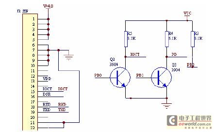 调试阶段,采用三极管驱动发光二极管,通过二极管明灭状态及时间来查表获得工作组态;成品设计中的下位机使用液晶显示,从液晶上直接简化显示各种工作状态,简化了硬件,只需加一个上拉电阻,采用双向口PB2 与之相连,通过软件读取引脚状态来判断GTM900B的工作组态。